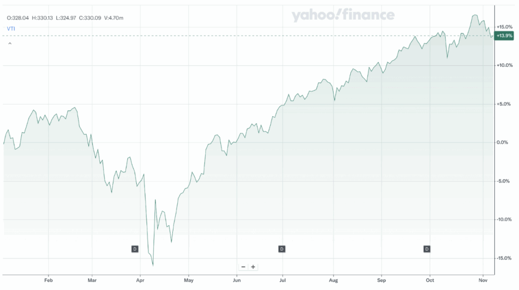 Imagine getting out of the market earlier this year because of fears of Trump or tariffs or the AI bubble. Look at how the US stock market has performed this year (using the Vanguard Total US Stock Market ETF, ticker VTI, as a proxy for the whole market). It’s up 13.9% as of November 9, 2025. Especially look at how it has performed after the tariffs-induced crash in April. Holy rebound, Batman!